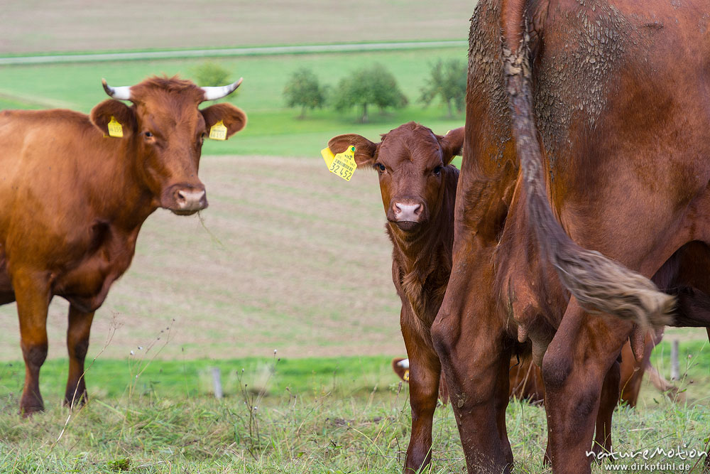 Harzer Rotvieh, Hausrind, Bos taurus, Bovidae, weidende Tiere, Naturschutzgebiet Gipskastlandschaft bei Hattorf, Harz, Hattorf am Harz, Deutschland