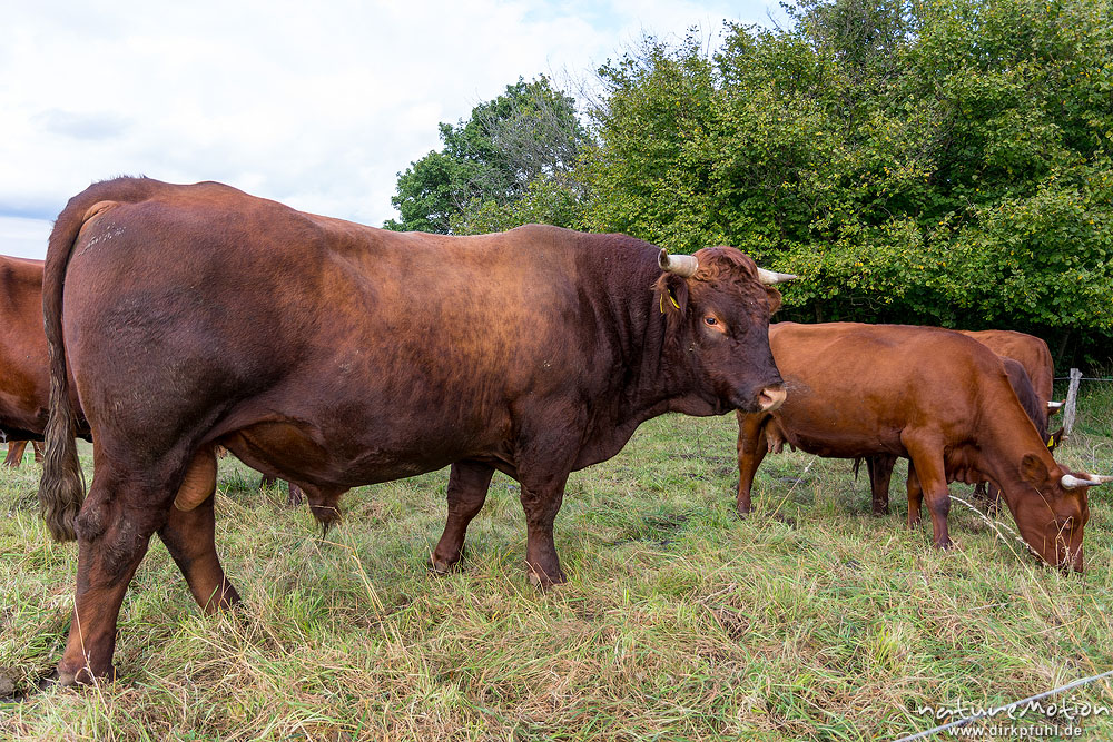 Harzer Rotvieh, Hausrind, Bos taurus, Bovidae, weidende Tiere, Naturschutzgebiet Gipskastlandschaft bei Hattorf, Harz, Hattorf am Harz, Deutschland