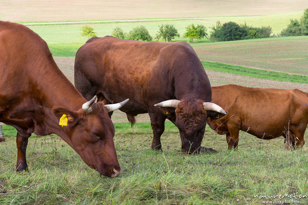 Harzer Rotvieh, Hausrind, Bos taurus, Bovidae, weidende Tiere, Naturschutzgebiet Gipskastlandschaft bei Hattorf, Harz, Hattorf am Harz, Deutschland