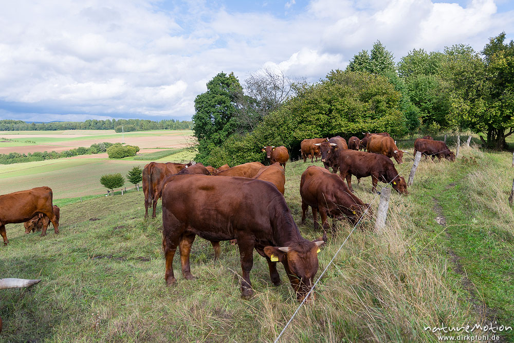 Harzer Rotvieh, Hausrind, Bos taurus, Bovidae, weidende Tiere, Naturschutzgebiet Gipskastlandschaft , Hattorf am Harz, Deutschland