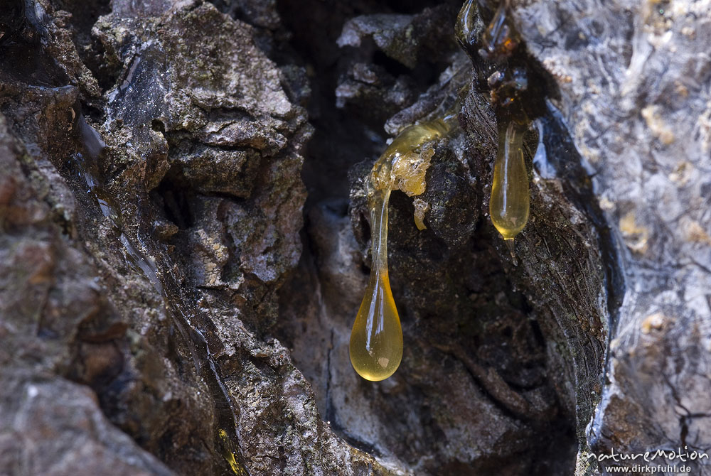 Harztropfen an Kiefernborke, Campingplatz Baldarin, Cres, Kroatien