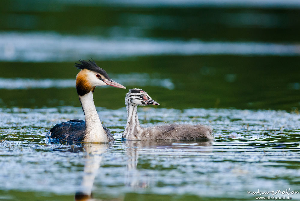 Haubentaucher, Podiceps cristatus, Podicipedidae, älteres Küken mit Alttier, schwimmend, Kiessee, A , Göttingen, Deutschland