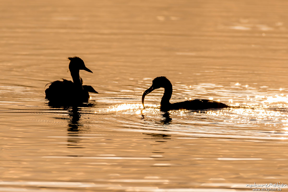 Haubentaucher, Podiceps cristatus, Podicipedidae, Alttier schwimmt mit gefangenem Fisch zum Jungtier, Seeburger See, Deutschland