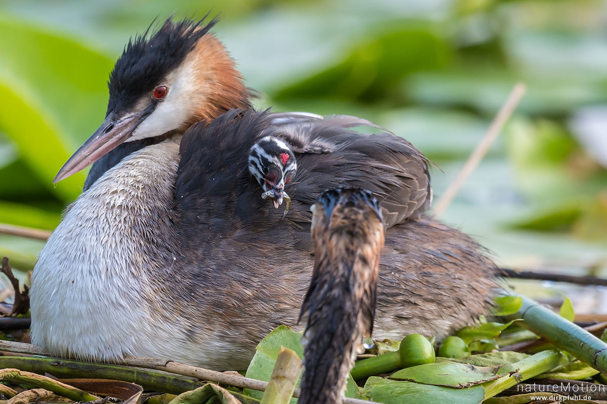 Haubentaucher, Podiceps cristatus, Podicipedidae, Alttiere auf ihrem Nest, Küken wird gefüttert, Seeburger See, Deutschland