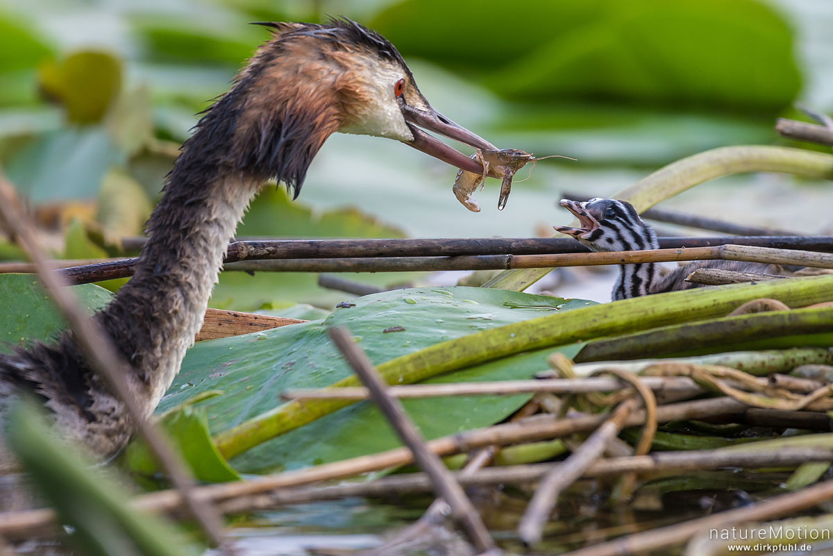Haubentaucher, Podiceps cristatus, Podicipedidae, Alttiere auf ihrem Nest, Küken wird mit Krebs gefüttert, Seeburger See, Deutschland