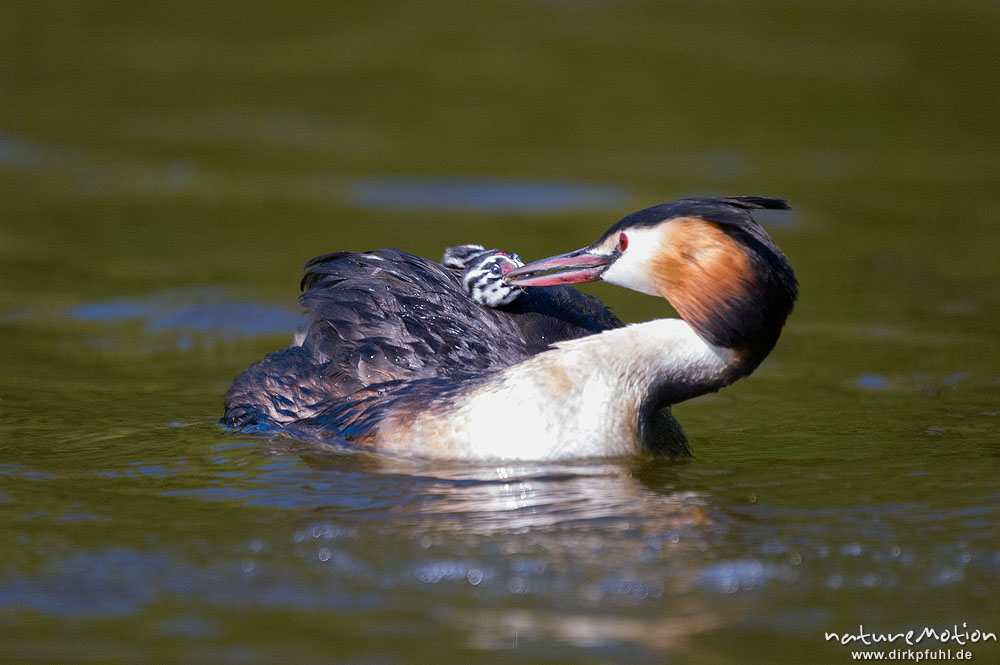 Haubentaucher, Podiceps cristatus, Podicipedidae, Altvögel mit Küken, Transport im Gefieder, füttern, Kiessee, Göttingen, Deutschland