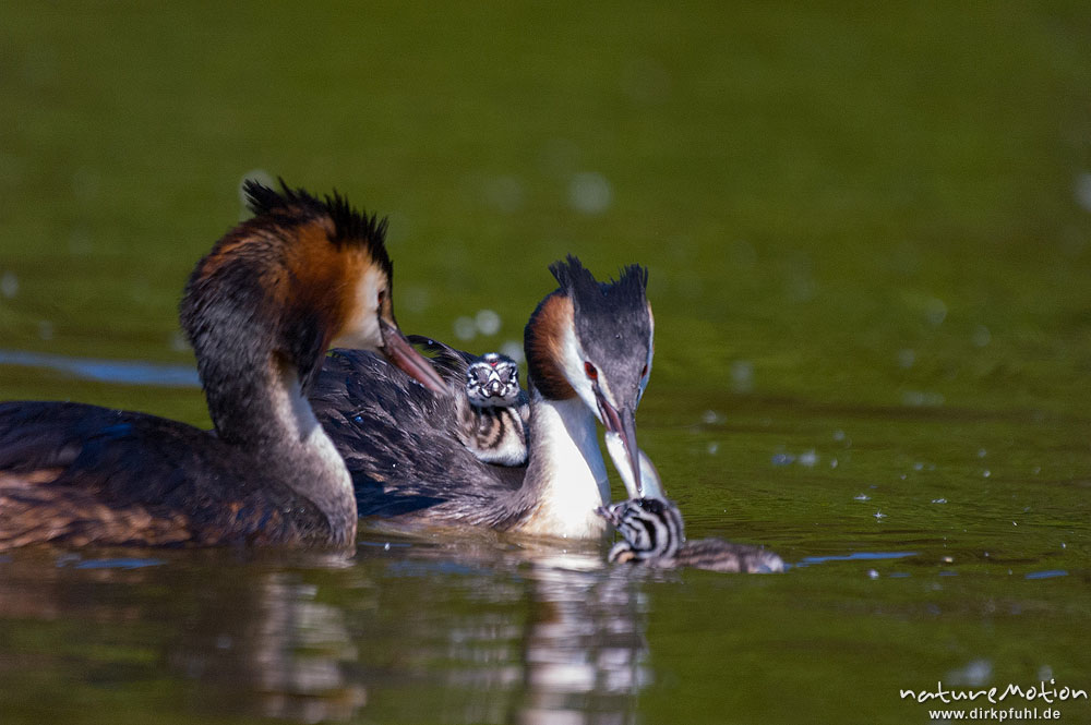 Haubentaucher, Podiceps cristatus, Podicipedidae, Altvögel mit Küken, Transport im Gefieder, füttern, Kiessee, Göttingen, Deutschland