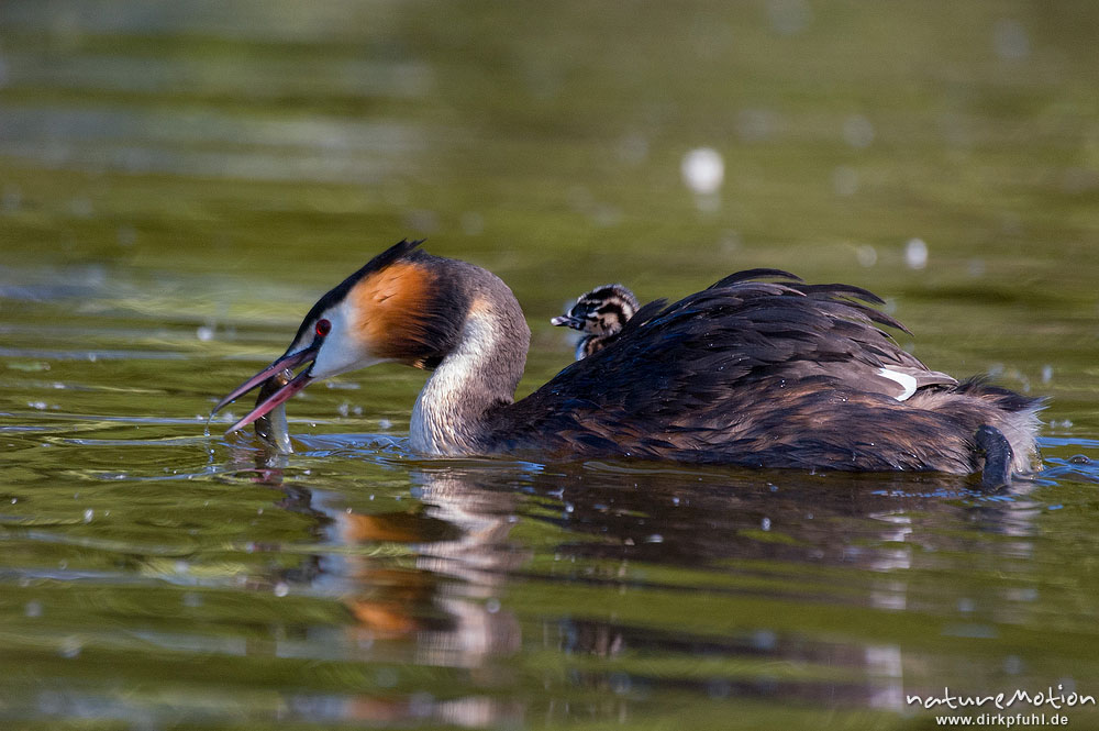 Haubentaucher, Podiceps cristatus, Podicipedidae, Altvögel mit Küken, Transport im Gefieder, füttern, Kiessee, Göttingen, Deutschland