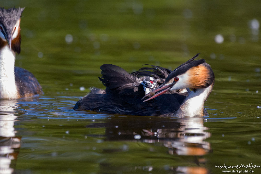 Haubentaucher, Podiceps cristatus, Podicipedidae, Altvögel mit Küken, Transport im Gefieder, füttern, Kiessee, Göttingen, Deutschland