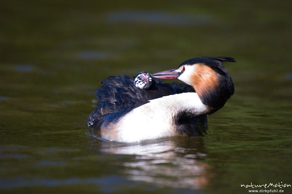 Haubentaucher, Podiceps cristatus, Podicipedidae, Altvögel mit Küken, Transport im Gefieder, füttern, Kiessee, Göttingen, Deutschland
