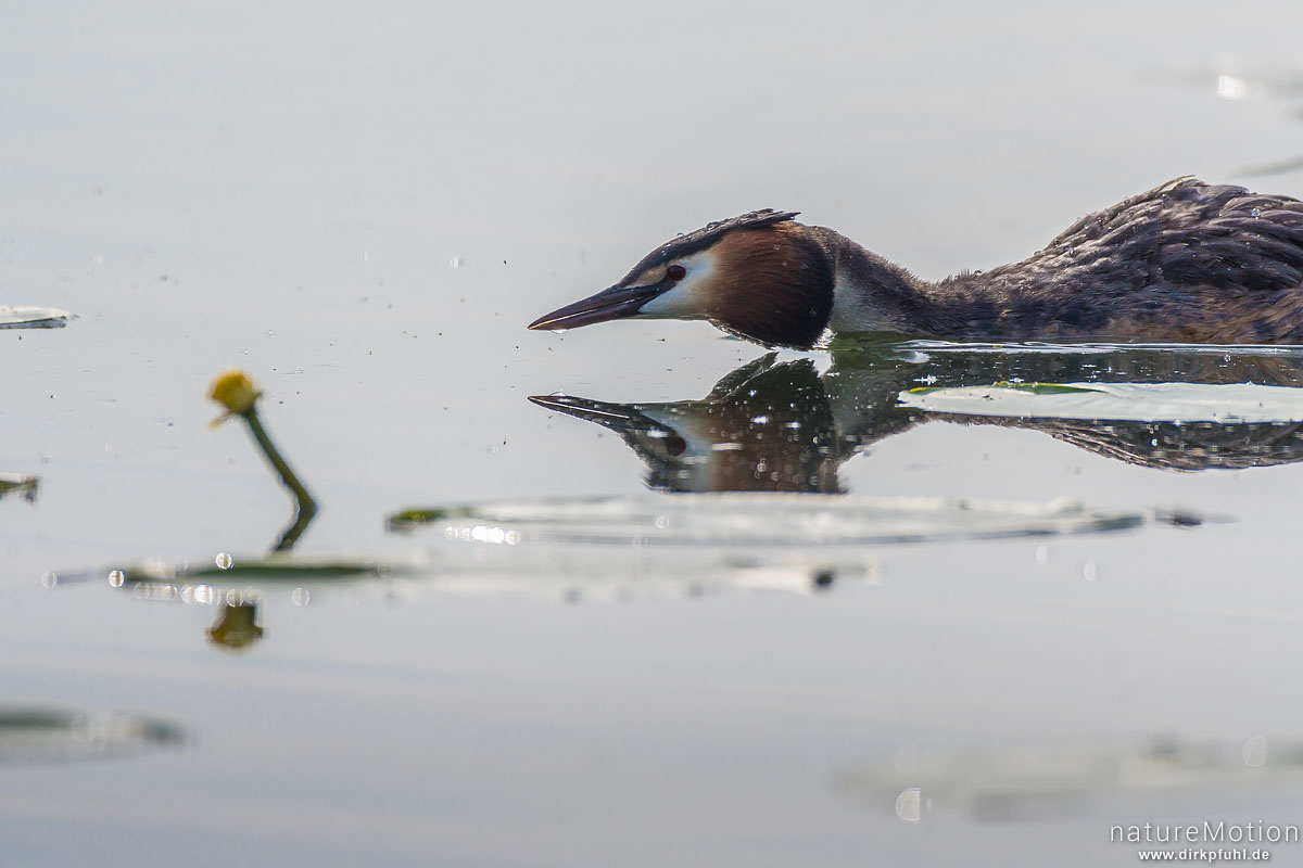 Haubentaucher, Podiceps cristatus, Podicipedidae, liegt auf Wasseroberfläche, Drohgebärde, Seeburger See, Deutschland