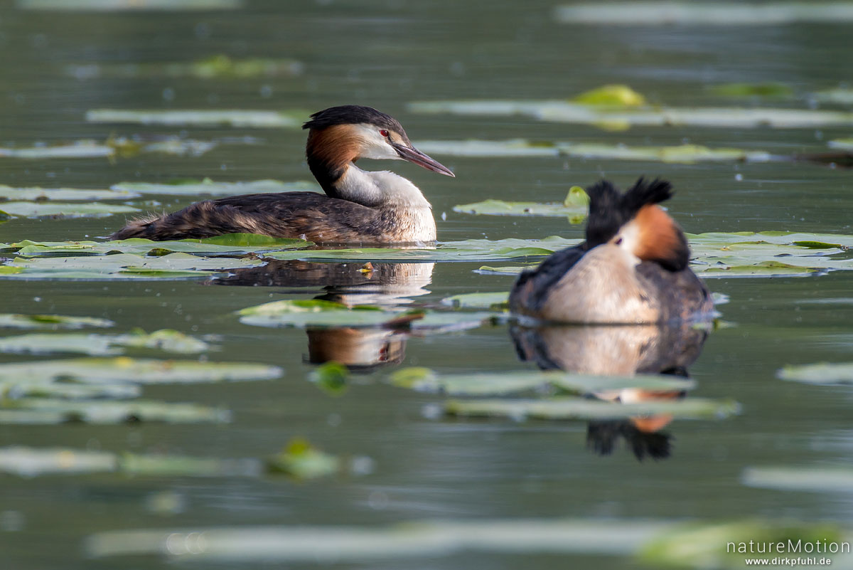 Haubentaucher, Podiceps cristatus, Podicipedidae, Paar schwimmt zwischen Seerosenblättern, Seeburger See, Deutschland