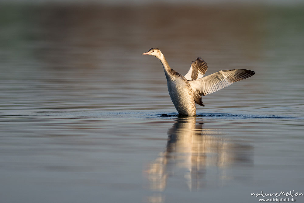 Haubentaucher, Podiceps cristatus, Podicipedidae, schlägt mit den Flügeln, A nature document - not arranged nor manipulated, Seeburger See, Deutschland