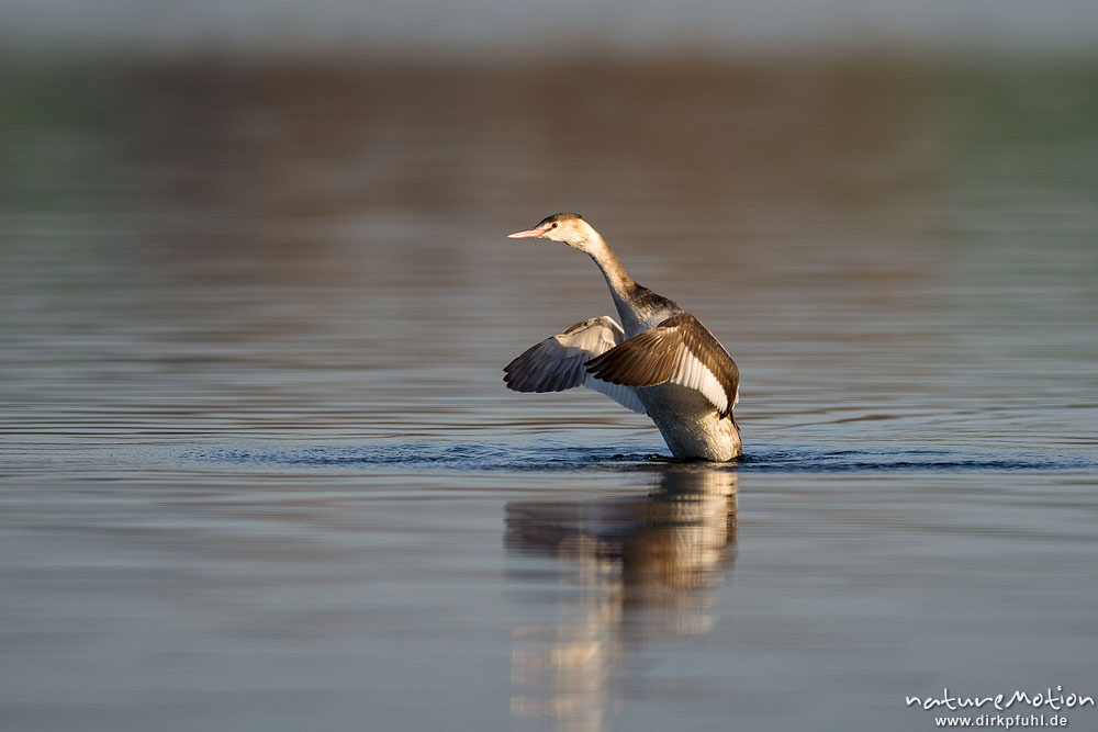 Haubentaucher, Podiceps cristatus, Podicipedidae, schlägt mit den Flügeln, A nature document - not arranged nor manipulated, Seeburger See, Deutschland