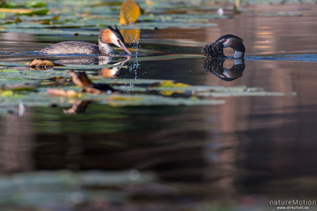 Haubentaucher, Podiceps cristatus, Podicipedidae, schwimmendes Tier mit Nistmaterial, Seeburger See, Deutschland