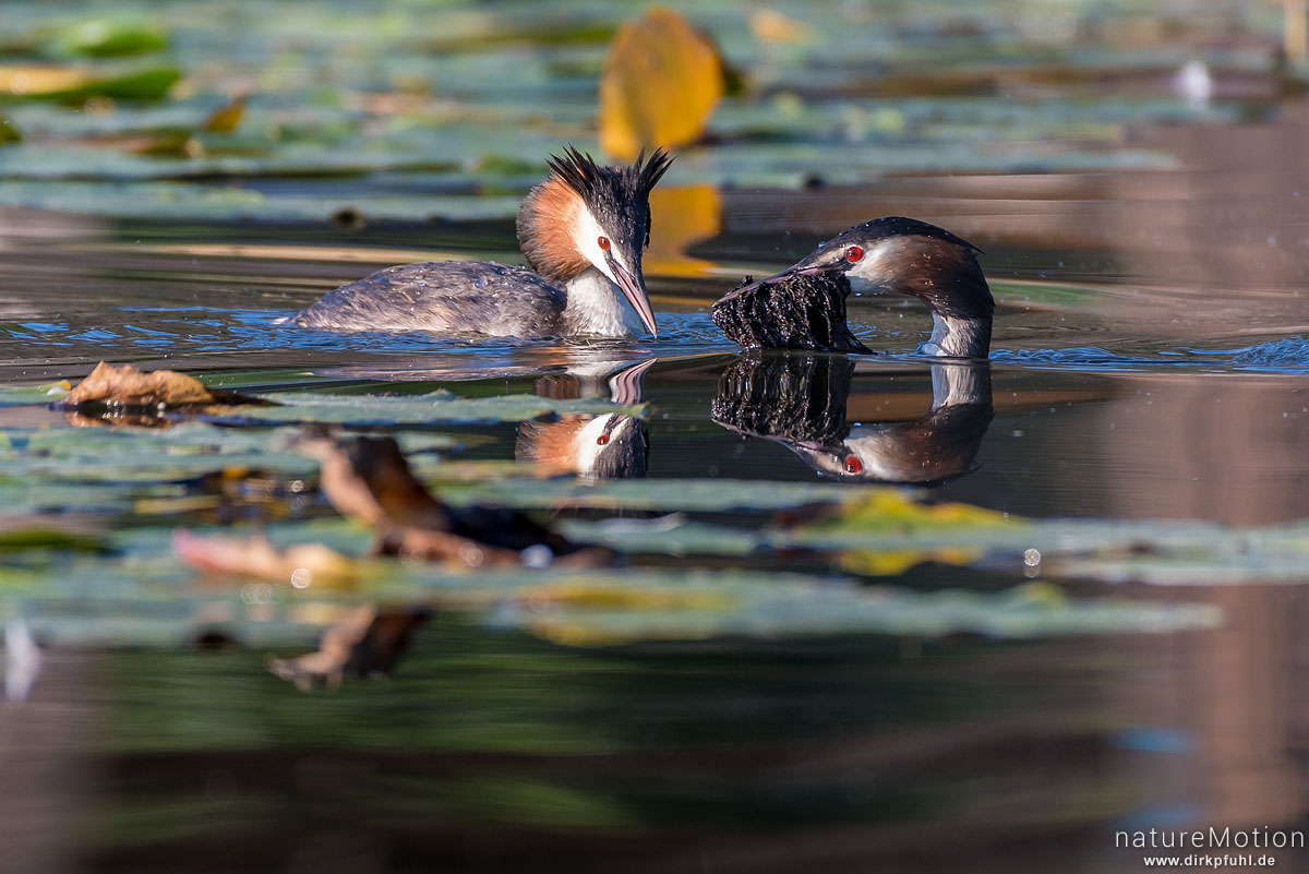 Haubentaucher, Podiceps cristatus, Podicipedidae, schwimmendes Tier mit Nistmaterial, Seeburger See, Deutschland