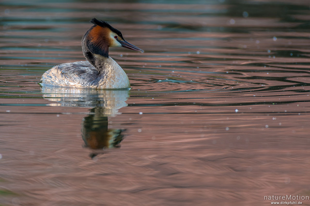 Haubentaucher, Podiceps cristatus, Podicipedidae, schwimmt zwischen Seerosenblättern, Seeburger See, Deutschland