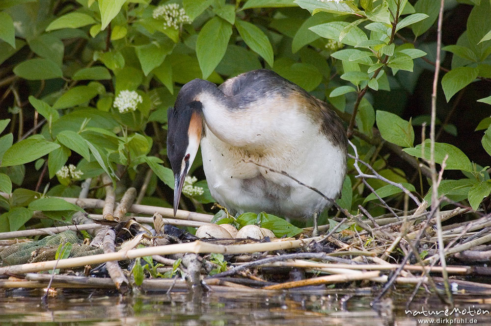Haubentaucher, Podiceps cristatus, Podicipedidae, Weibchen auf Nest beim brüten, Eier im Nest sichtbar, Kiessee, Göttingen, Deutschland