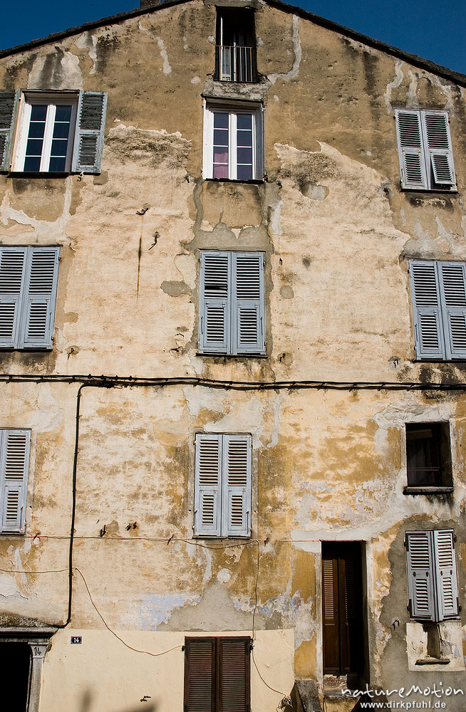Hausfassade mit fleckigem Putz, Altstadt von Corte, Korsika, Frankreich