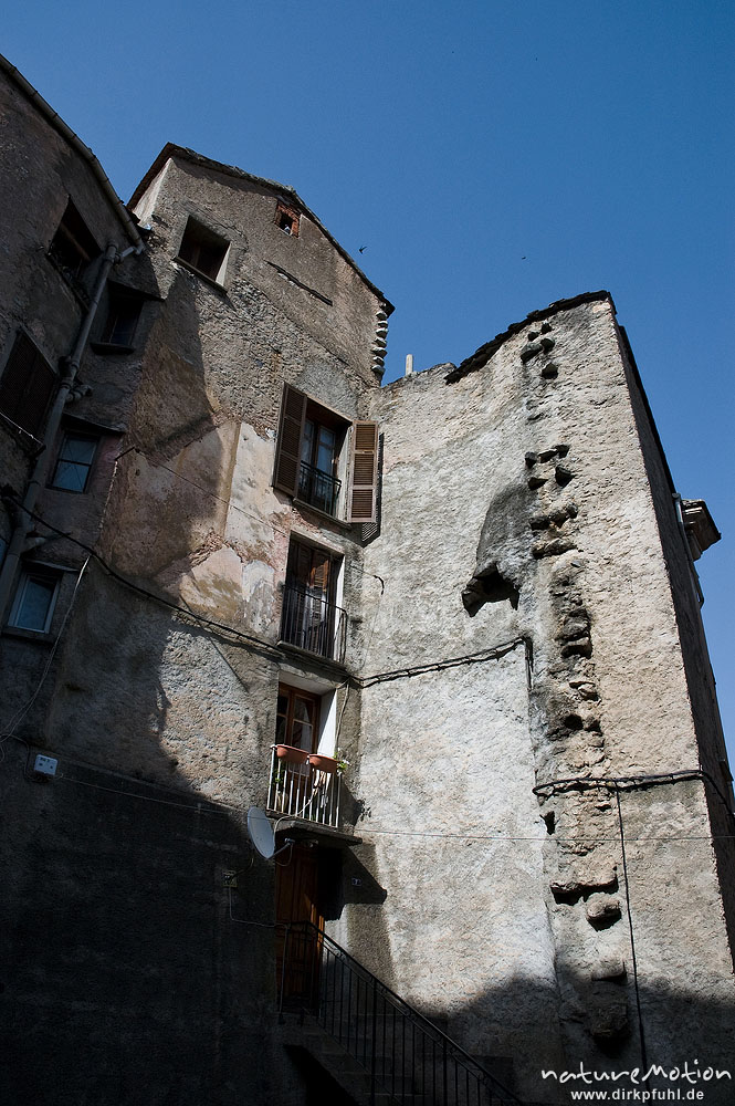 Hausfassade mit stark verwittertem Putz und Abflussrohren, Altstadt von Corte, Korsika, Frankreich