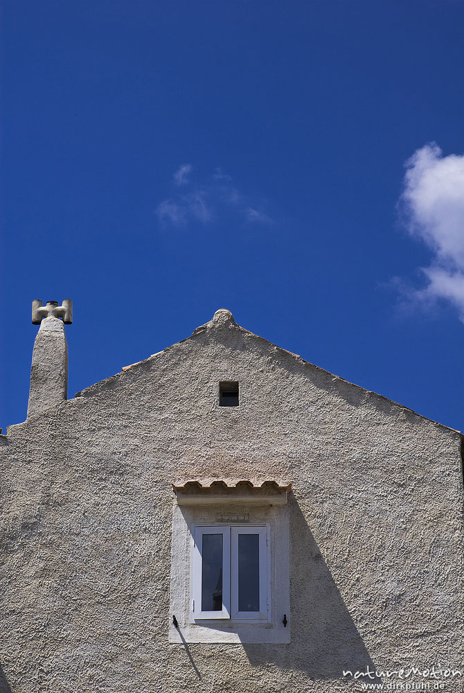 Hausgiebel mit Fenster und Kamin, blauer Himmel Lubenice, Kroatien