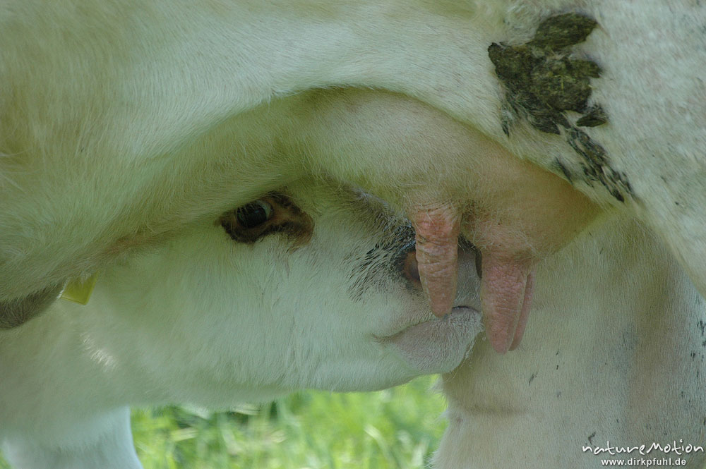 Hausrind, Bos taurus, Bovidae, Kalb beim säugen, Euter Seeburger See, Deutschland