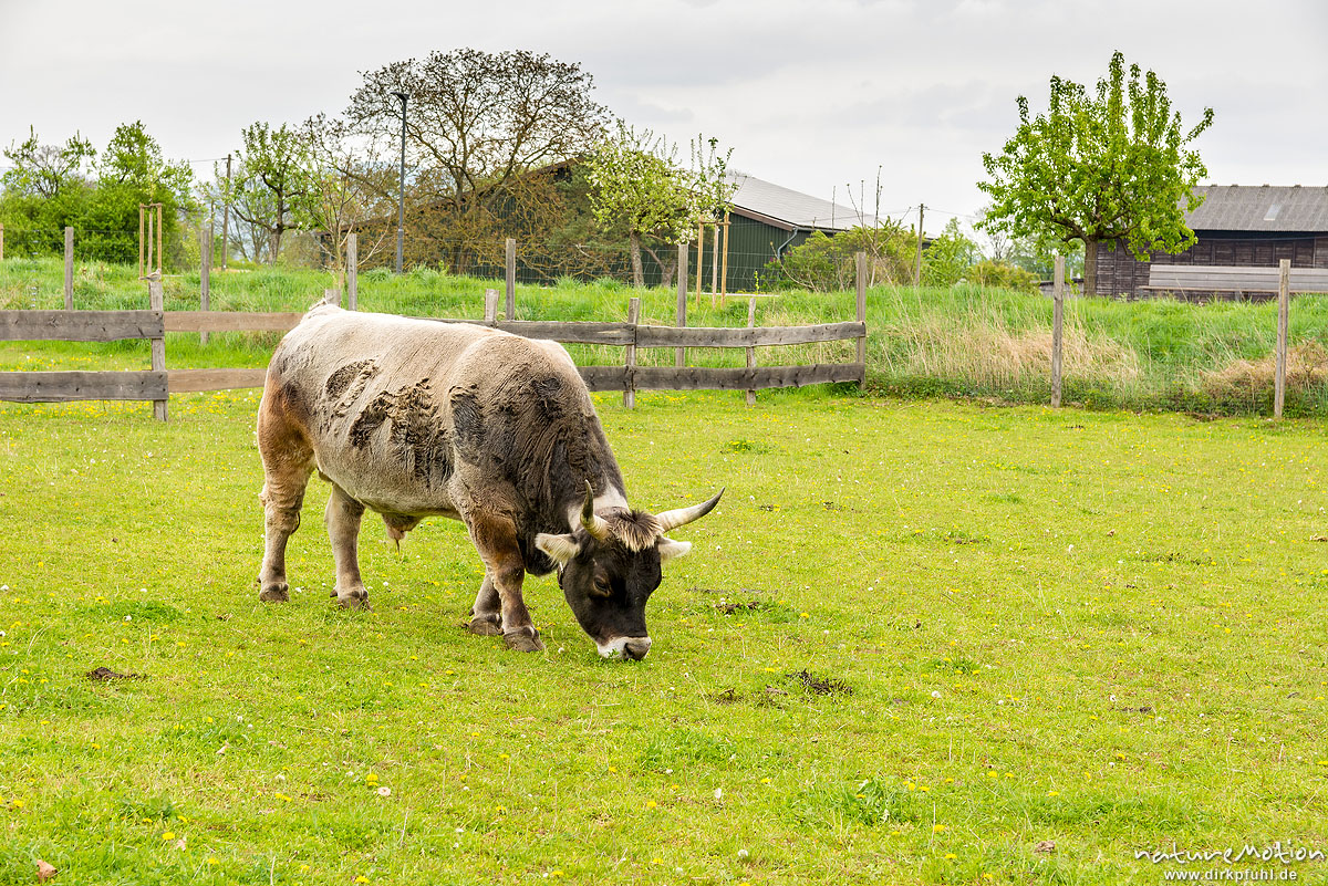 Hausrind, Bos taurus, Bovidae, Rätisches Grauvieh, Bulle auf Weide, Freilichtlabor Lauresham, Lorsch, Deutschland