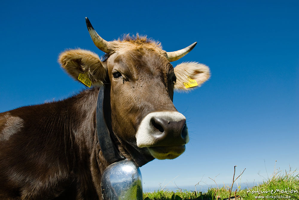 Hausrind, Bos taurus, Bovidae, ruhende Kuh auf Bergwiese, Hochgrat, Scheidegg, Deutschland