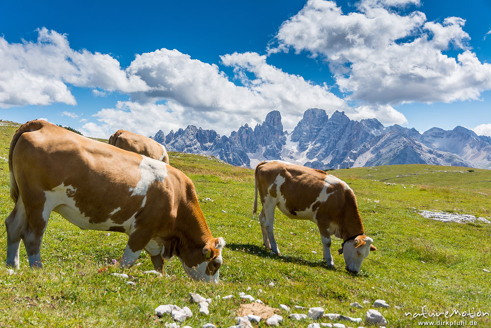 Hausrind, Bos taurus, Bovidae, weidende Tiere, Almwiesen unterhalb der Strudelköpfe, im Hintergrund , Dolomiten, Italien