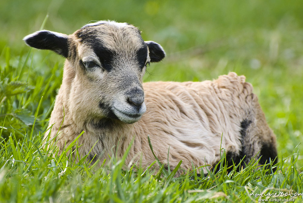 Hausschaf, Ovis gmelini aries, Bovidae, Lamm liegt im Gras, Wendershausen bei Witzenhausen, Deutschland