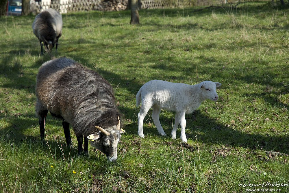 Hausschaf, Ovis gmelini aries, Bovidae, Lamm mit Muttertier Wendershausen bei Witzenhausen, Deutschland