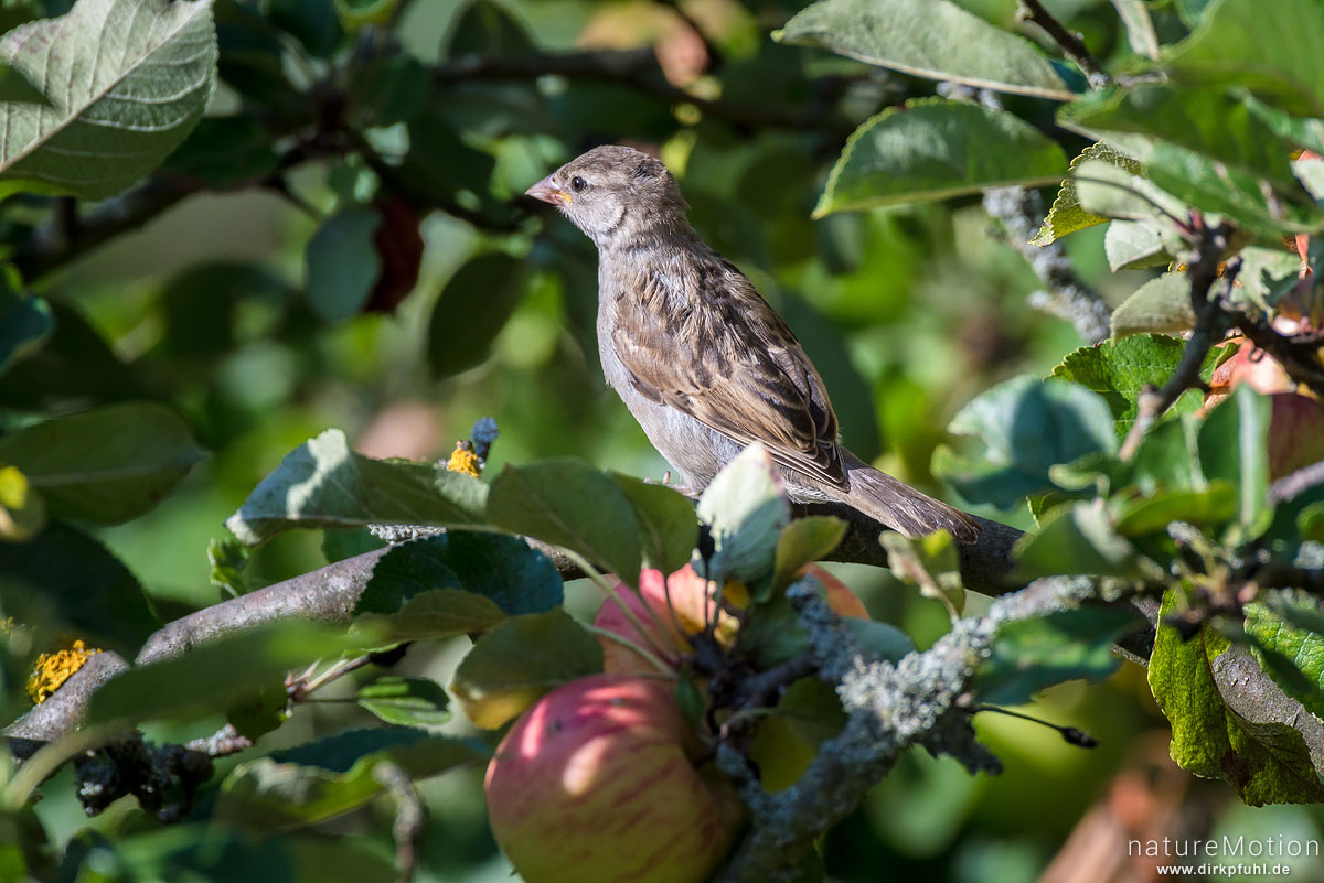 Haussperling, Spatz, Passer domesticus, Sperlinge (Passeridae), in Apfelbaum, Garten Am Weißen Steine, Göttingen, Deutschland