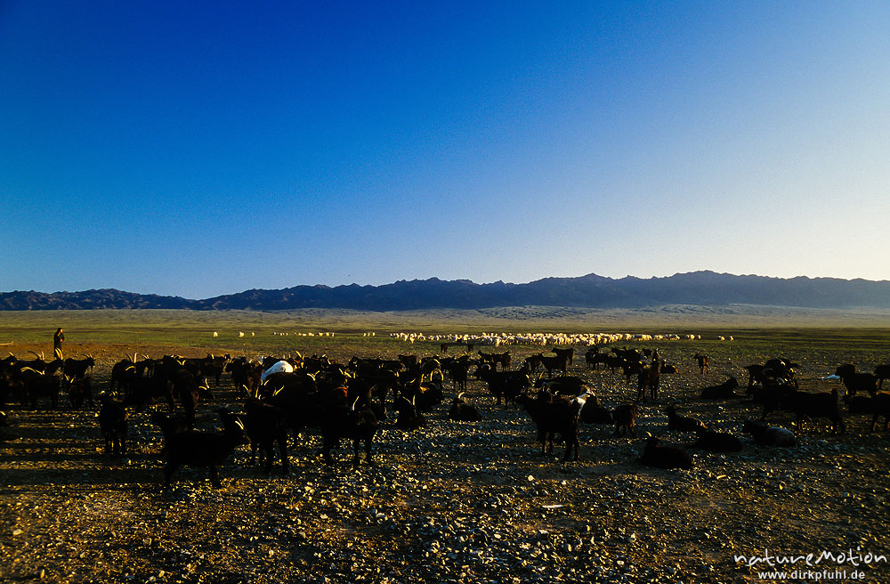 Hausziege, Capra hircus, Bovidae, Hausschaf, Ovis gmelini aries, Bovidae, Herden beim morgendlichen , Wüste Gobi, Mongolei