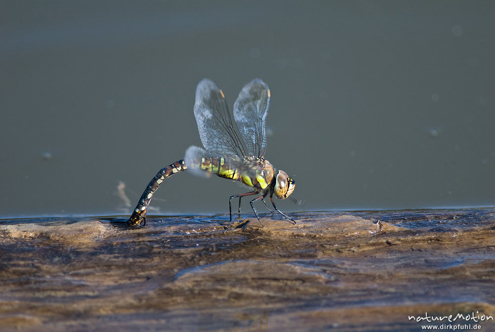 Herbst-Mosaikjungfer, Aeshna mixta, Aeshnidae, Weibchen bei der Eiablage in schwimmendes Holzstück, , Reinhausen bei Göttingen, Deutschland