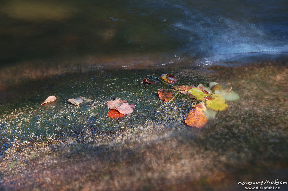 Herbstlaub auf Stein, Bergbach, strömendes Wasser, Bode bei Thale Bodetal, Deutschland