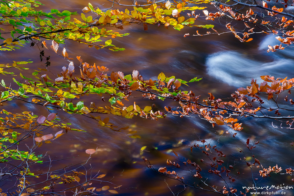 Herbstlaub vor str?mendem Wasser, Bode, Bodetal, Harz, Deutschland