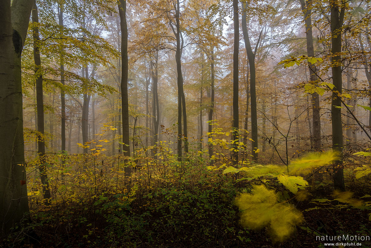 Herbstwald, Buchenwald mit Herbstlaub, Nebel, Göttinger Wald, Göttingen, Deutschland