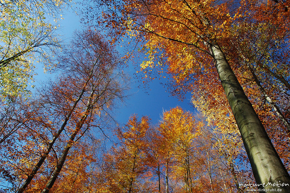 Herbstwald gegen blauen Himmel, im Wind sich bewegende Blätter, Göttinger Wald Göttingen, Deutschland