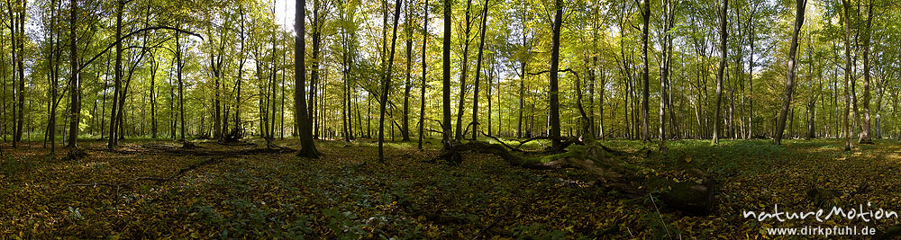 Herbstwald, Hainbuchen und Rot-Buchen in Herbstfärbung, Laubstreu, Schatten, Gegenlicht, Göttingen, Deutschland