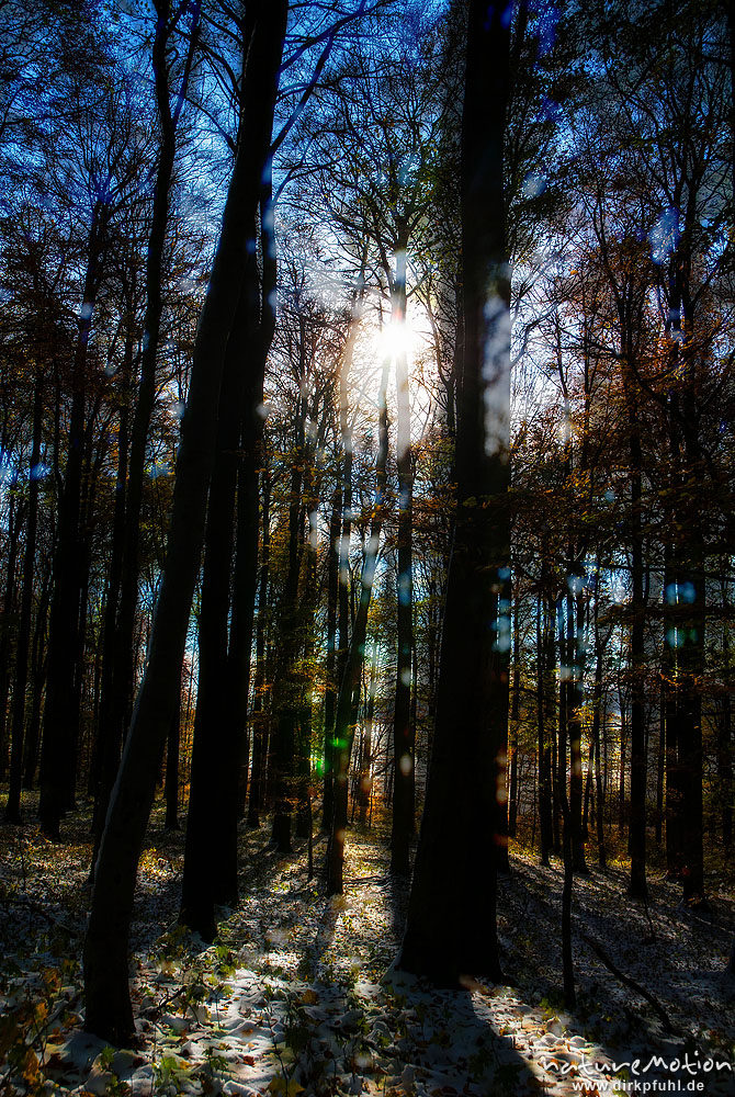 Herbstwald mit dünner Schneedecke, Rot-Buchen, Eichen und Kastanien, Laubfärbung, Nationalpark Hainich, Mehrfachbelichtung scharf/unscharf, Craula, Deutschland