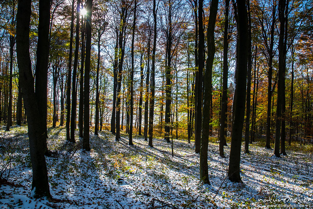 Herbstwald mit dünner Schneedecke, Rot-Buchen, Eichen und Kastanien, Laubfärbung, Nationalpark Hainich, Craula, Deutschland