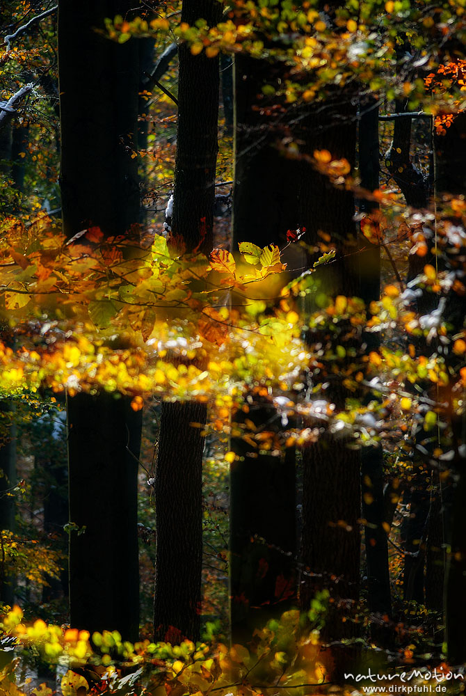 Herbstwald mit dünner Schneedecke, Rot-Buchen, Eichen und Kastanien, Laubfärbung, Nationalpark Hainich, Mehrfachbelichtung scharf/unscharf, Craula, Deutschland
