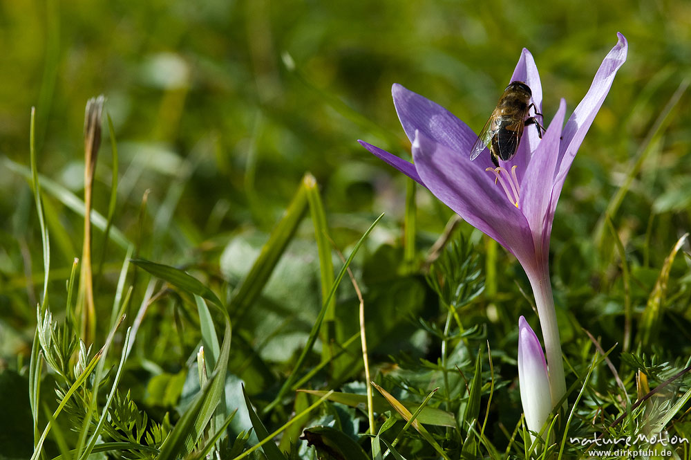 Herbstzeitlose, Colchicum autumnale, Liliaceae, Blüte mit Antheren, Biene, Wiese, Geroldsee Klais Oberbayern, Deutschland