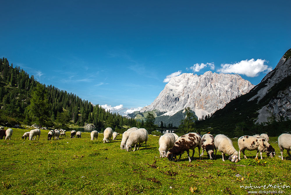 Herde grasender Schafe, Almwiese am Seebensee, Blick auf Zugspitze, Ehrwald, Östereich