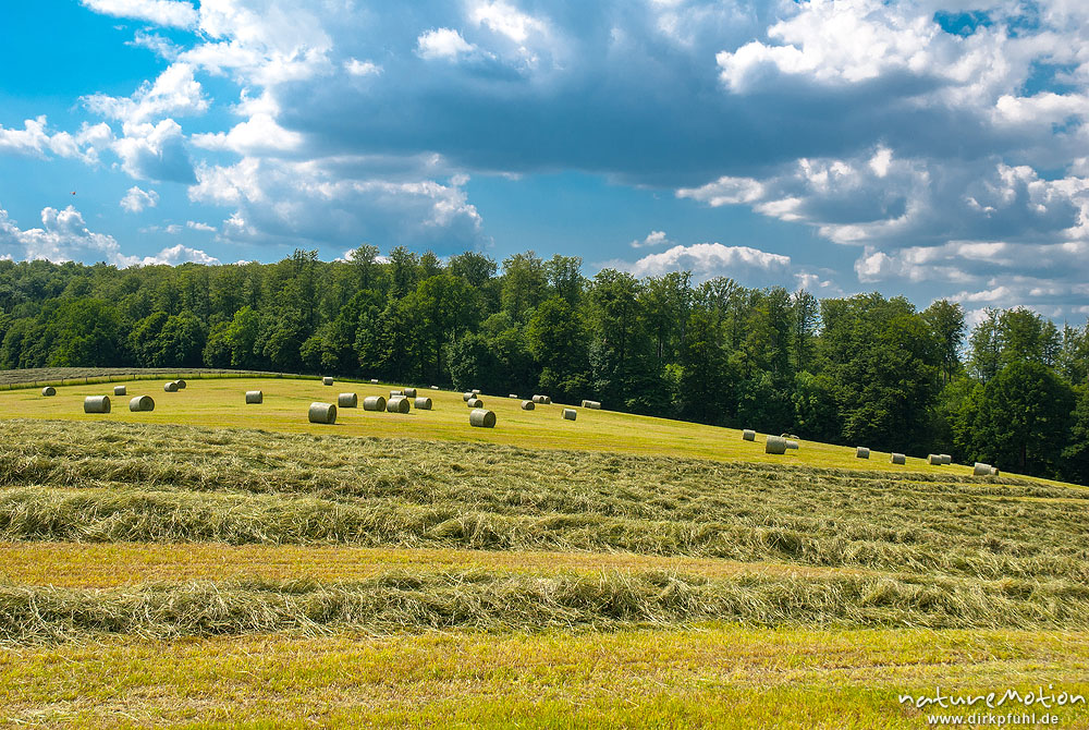 Heuballen und lose liegendes Heu auf gemähter Wiese, Bettenrode, Reinhausen bei Göttingen, Deutschland