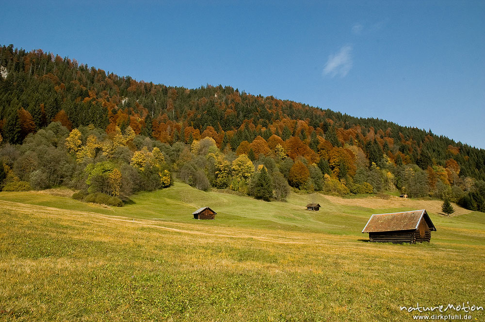 Heuschober, Wiesen und Herbstwald, Geroldsee Klais, Deutschland