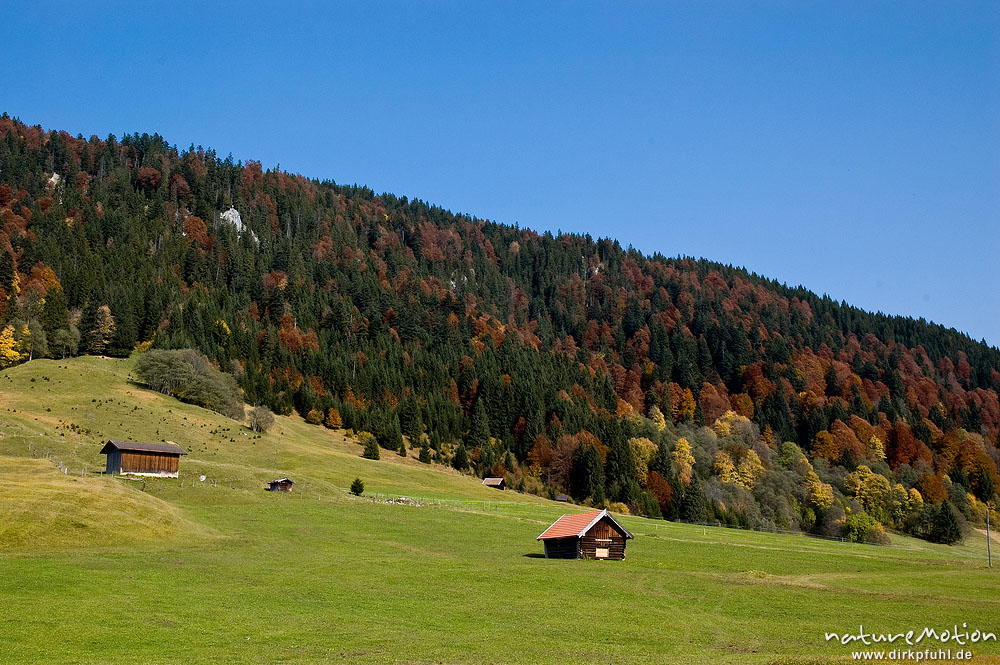 Heuschober, Wiesen und Herbstwald, Geroldsee Klais, Deutschland