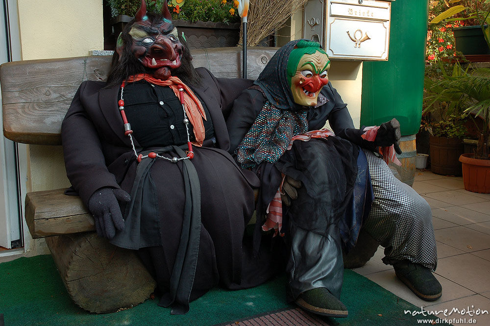 Hexe und Teufel, Puppen, lebensgroß, sitzend auf Bank vor Restaurant Hexentreff, Thale, , Deutschland