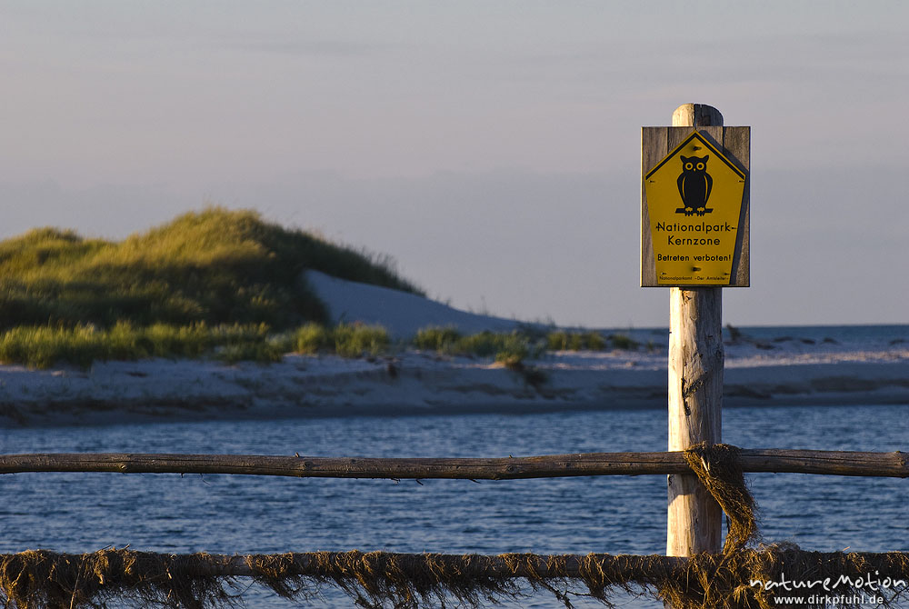 Hinweisschild “Nationalpark – Kernzone” an Holzzaun, im Hintergrund Hafeneinfahrt und Dünen Darsser , Darß, Zingst, Deutschland