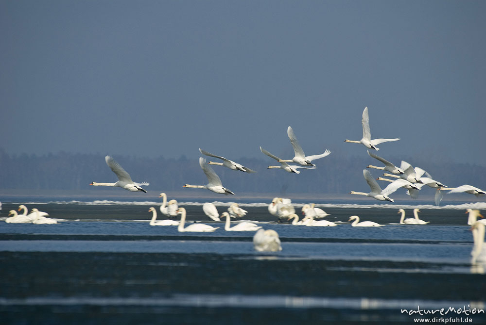 Höckerschwan, Cygnus olor, Anatidae, großer Trupp schwimmend in seichter Bucht, mehrere Tiere fliegen auf, Ufer mit Eisschollen, Barther Bodden, A nature document - not arranged nor manipulated, Nisdorf, Deutschland
